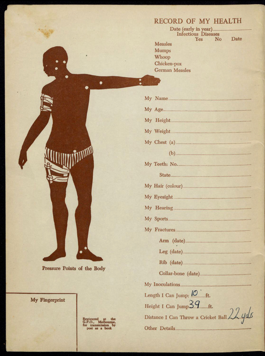 WHITCOMBES “HEALTH NOTEBOOK” SERIES MY NOTEBOOK OF HEALTH FOR GRADE 6 & FORM 1 MELBOURNE: WHITCOMBE & TOMBS Record of Health was designed for children to record bodily measurements, and covered topics of health such as, fresh air, sunshine, food, clothing, exercise, rest, sleep. The food advice given is combined with basic anatomical functions. Unlike other notebooks that focused on health alone, the goal was for primary school children to achieve happiness through good health, reflecting a move away from health being confined to the body. The recording of body measurements is still a part of school programs today.