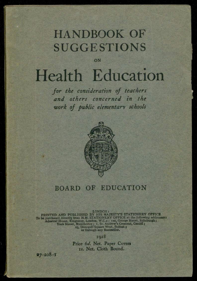 HANDBOOK OF SUGGESTIONS ON HEALTH EDUCATION FOR THE CONSIDERATION OF TEACHERS AND OTHERS CONCERNED IN THE WORK OF PUBLIC ELEMENTARY SCHOOLS BOARD OF EDUCATION (GREAT BRITAIN) LONDON: BOARD OF EDUCATION This book was a Manual on Health Education to be used by teachers across the hygiene syllabus. It has two main parts, ‘Subject Matter for Health Practice and Health Talks for Young Children’ and ‘Outlines of Health Lessons for Older Children’. The author hoped that teachers would not use it prescriptively but as a guide to the ‘generally accepted principles of hygiene upon the observance of which, in the ordinary daily life of the individual, the development and maintenance of sound bodily health depends.