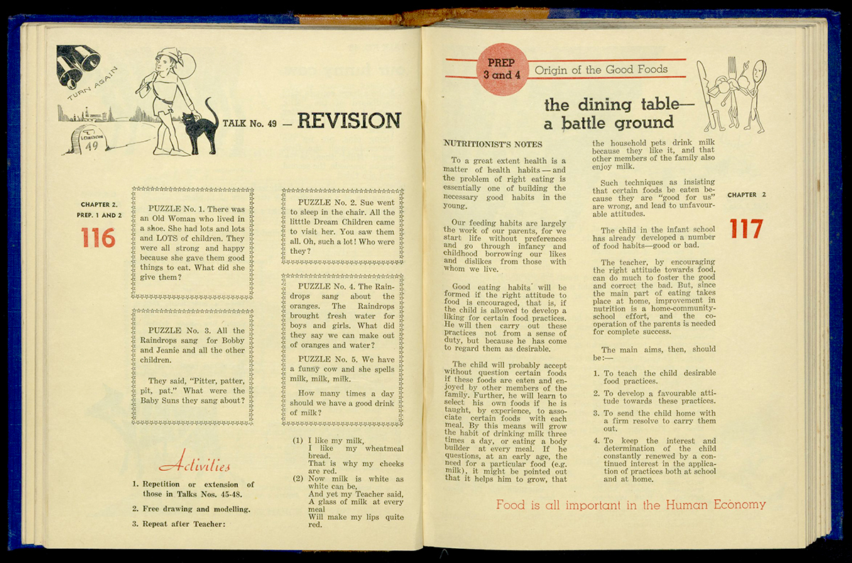 Various organisations also began to instruct the public, particularly mothers, on caring for families. Government, not for profit, commercial and media organisations all produced health resources. ‘Advice to mother’ publications offered menu ideas and advice on children’s diets. These gendered texts addressed mothers alone, and public health campaigns continue to use similar language today.