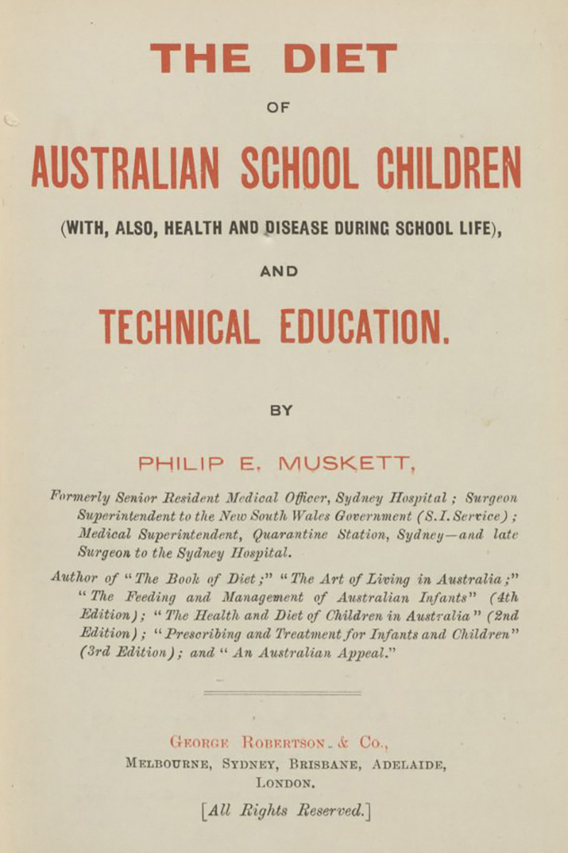 PHILIP E. MUSKETT (1857-1909) THE DIET OF AUSTRALIAN SCHOOL CHILDREN: (WITH, ALSO, HEALTH AND DISEASE DURING SCHOOL LIFE), AND TECHNICAL EDUCATION MELBOURNE: G. ROBERTSON & CO. In another introduction to reforming diet and health of school children, Philip Muskett pays particular attention to the importance of the Australian climate in relation to all aspects of diet and health. He notes that earlier books were overly dependent on British and American conditions, which were inappropriate for the ‘newly developing race’ of Australians.