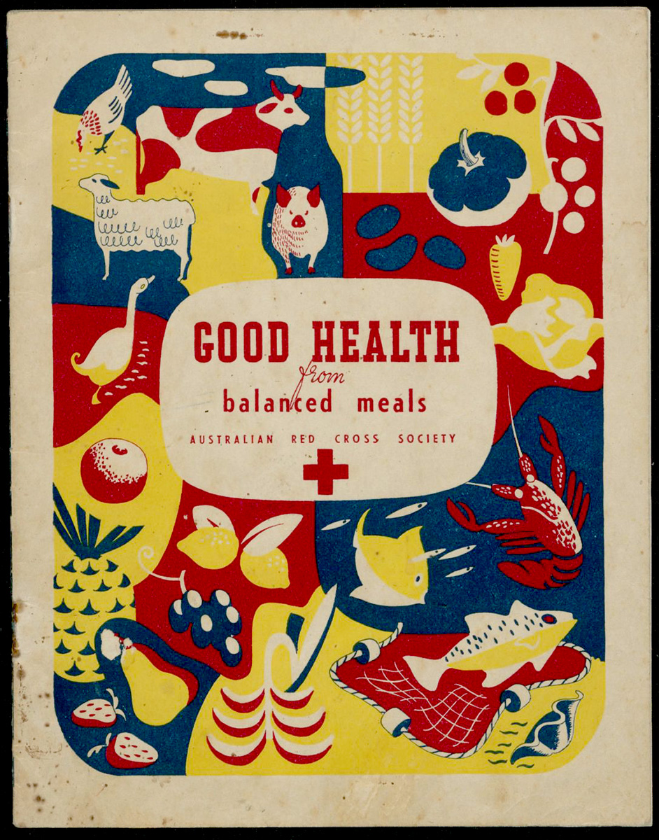 AUSTRALIAN RED CROSS SOCIETY GOOD HEALTH FROM BALANCED MEALS MELBOURNE: AUSTRALIAN RED CROSS SOCIETY Food consumption surveys undertaken in 1936 and 1944 by the Health Department showed that some Australians were not eating the ‘right kind of food.’ These findings resulted in the production of booklets such as this one, produced by the Red Cross to assist the Commonwealth Government to disseminate nutrition knowledge. It covers the basics of food essentials, providing meal charts that outlined the major food categories (vitamins, protein, calories) across two types of school lunch. (see poster)